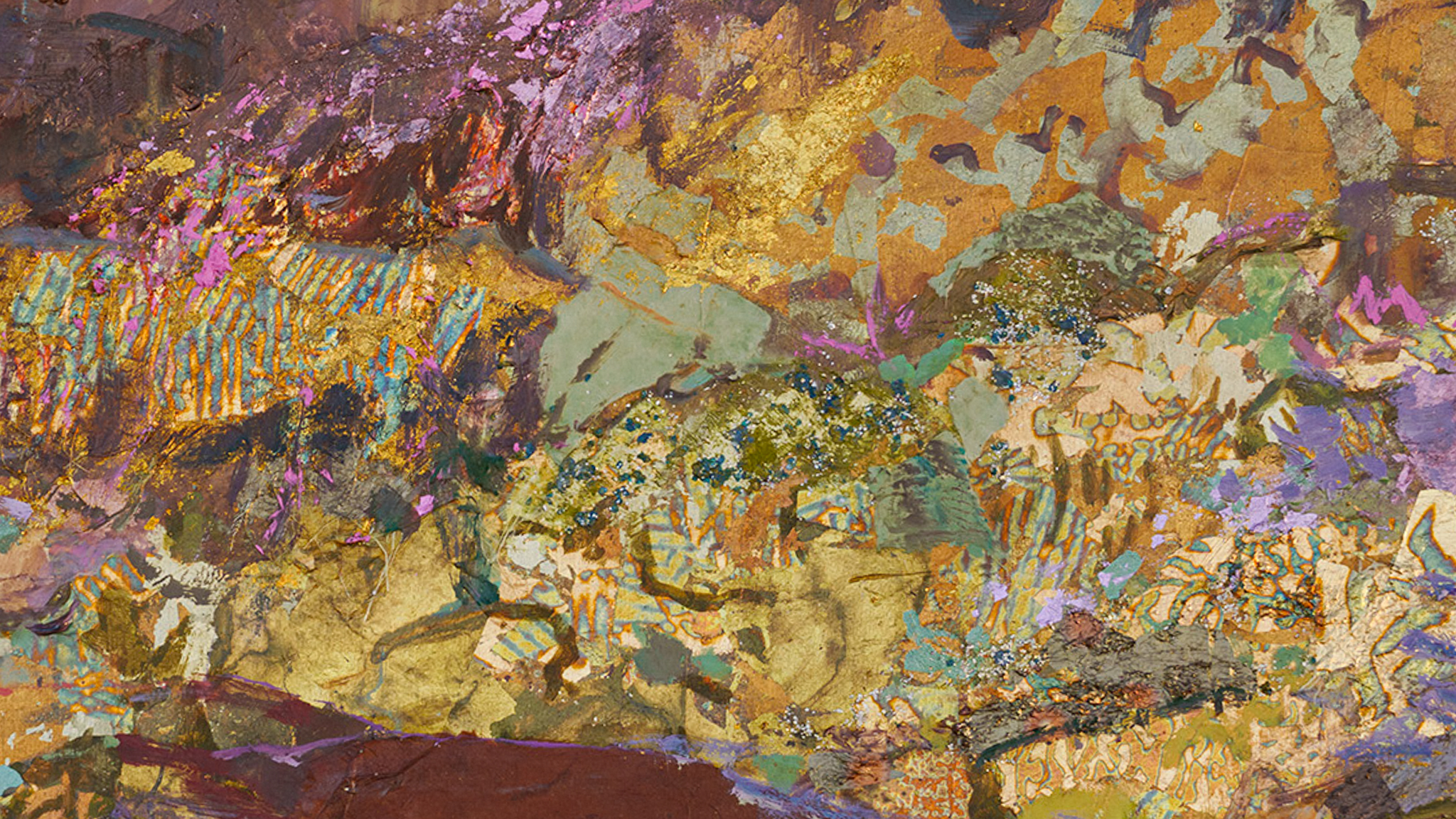 Over time the paintings began behaving less like images and more like ecological systems — nature expressing itself through human perception and material practice. Oil paint, opaque paper, reflective gold, and iridescent mother-of-pearl interact across layered surfaces as light shifts with the viewer’s movement.