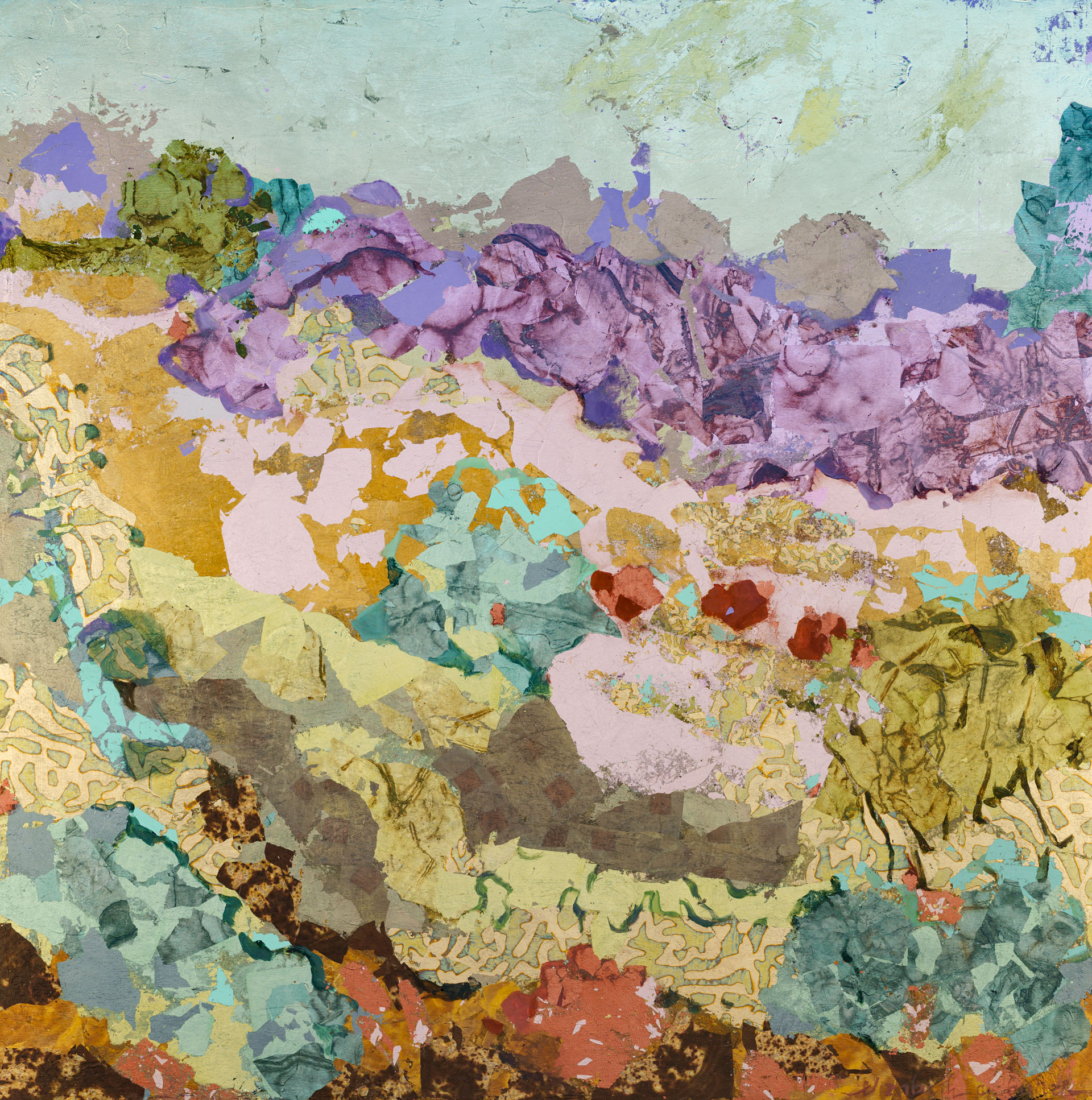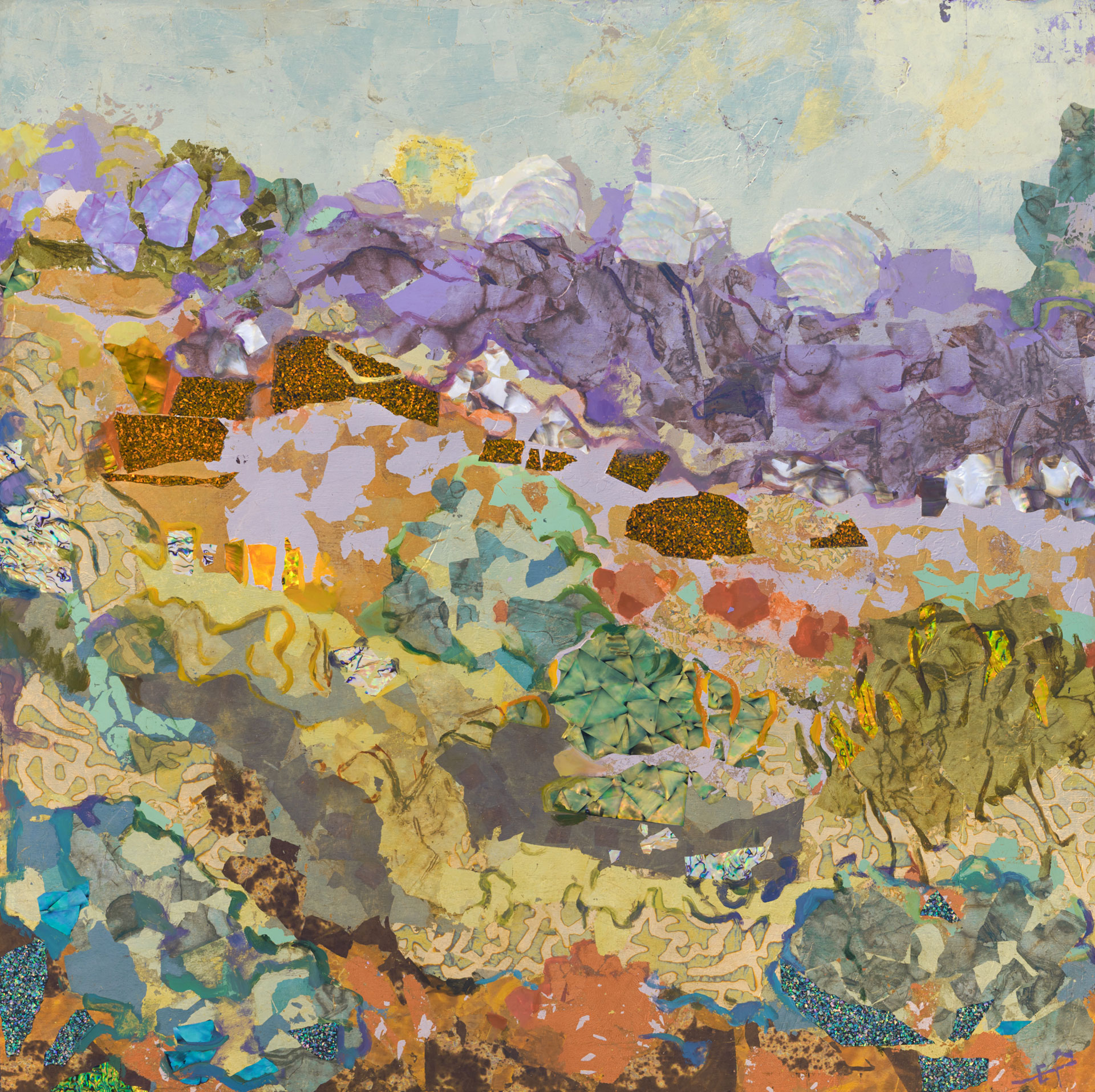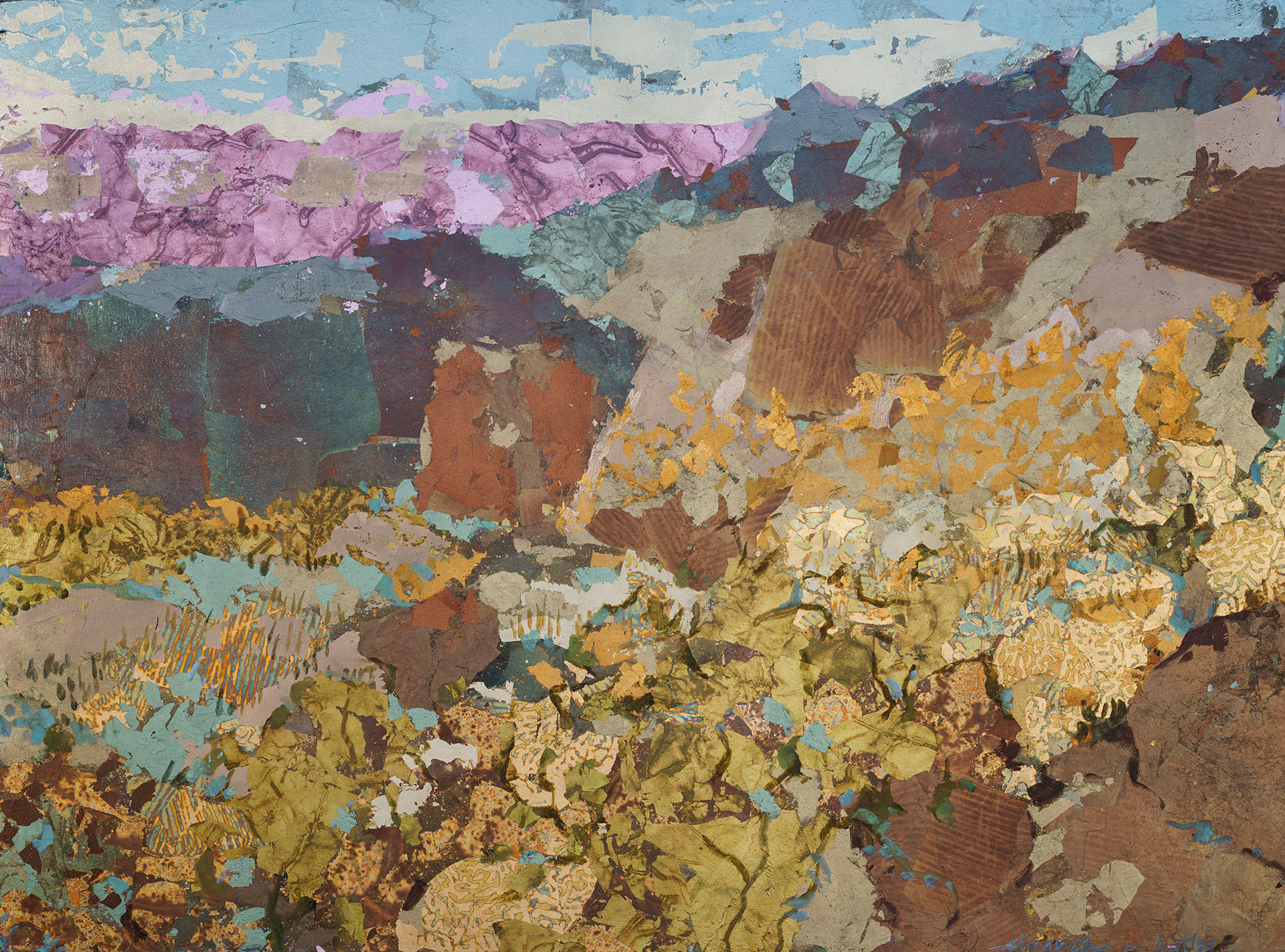 Re-entering this painting meant allowing the landscape to loosen rather than become more defined. Through successive layers of paper, paint, and mica, the surface grew increasingly textured, acquiring a new depth.