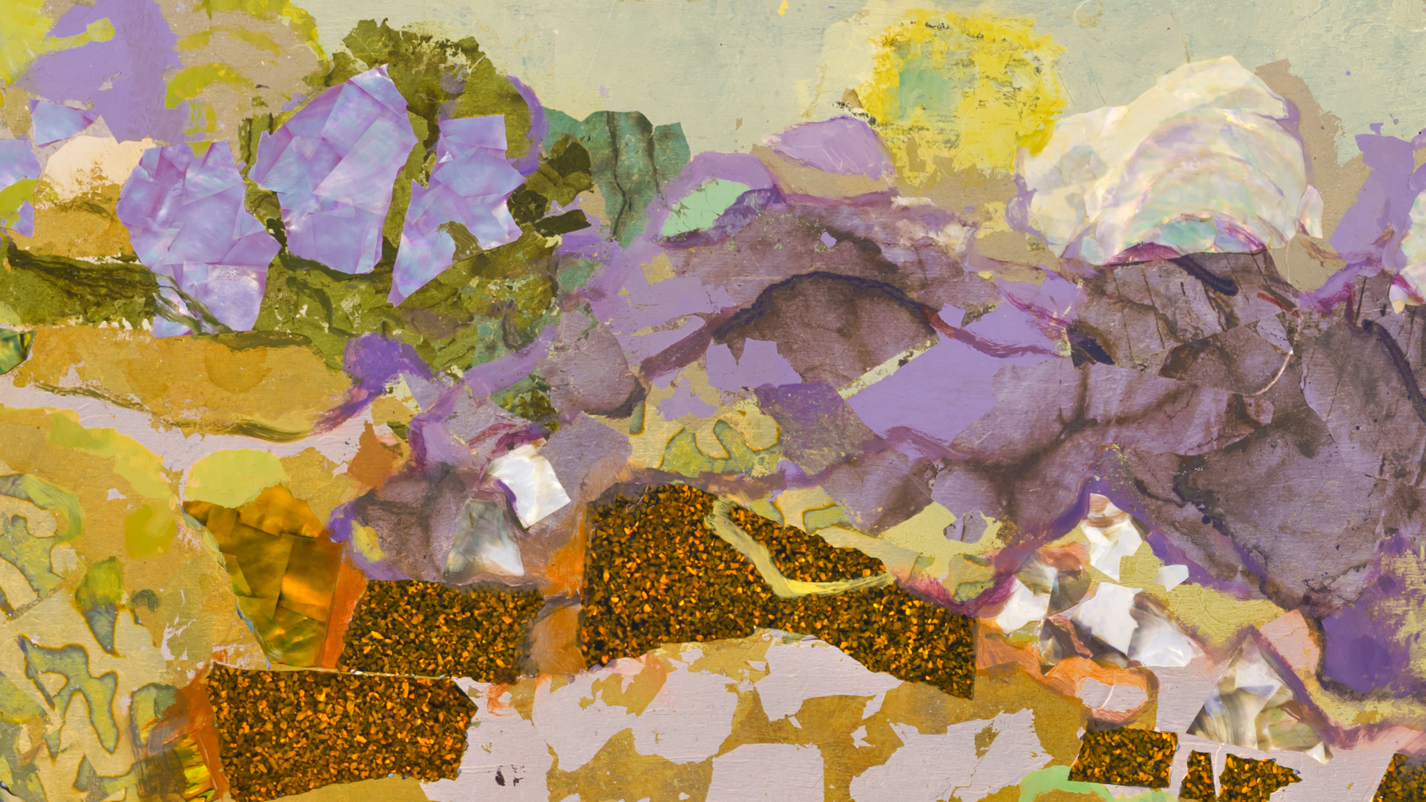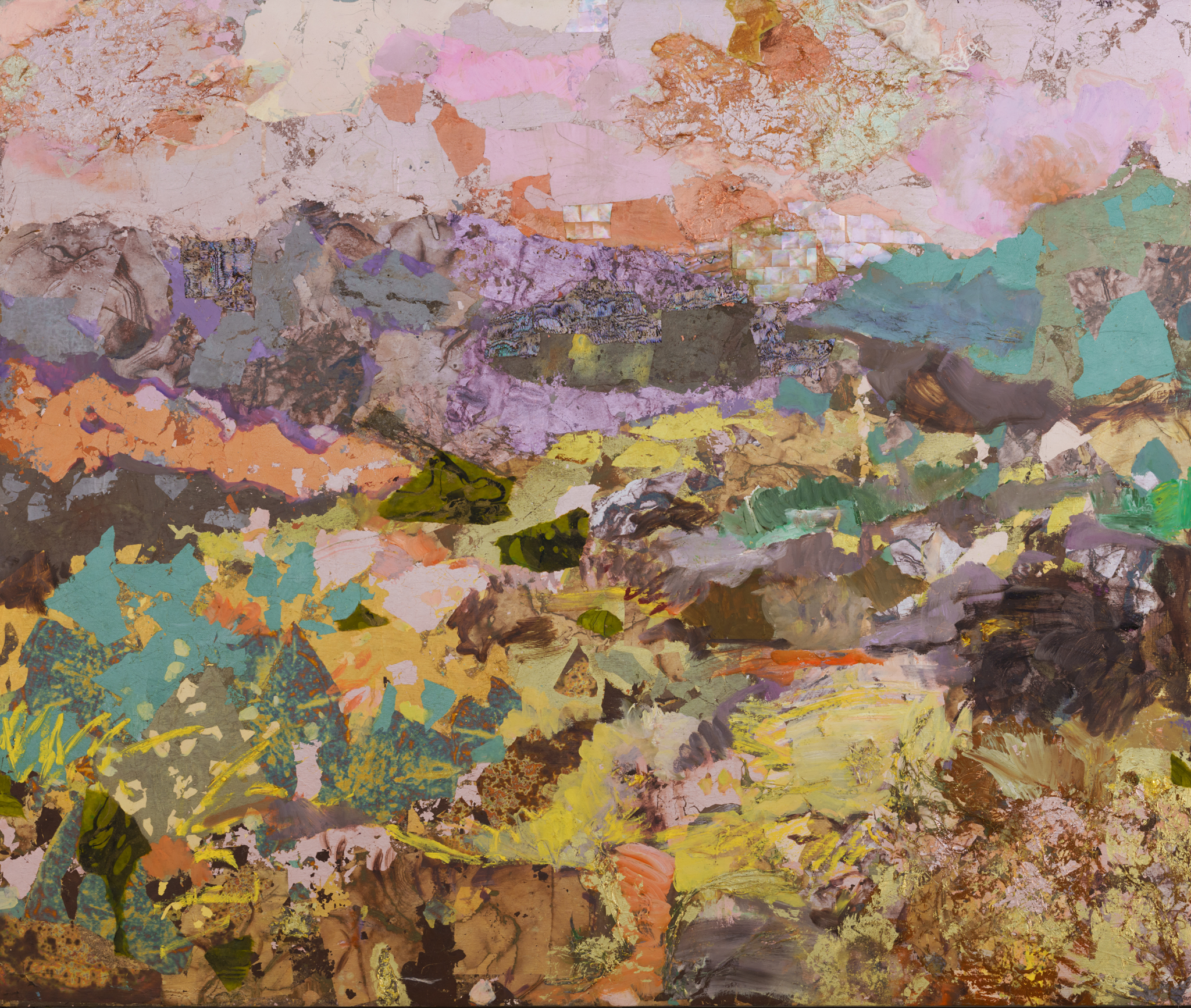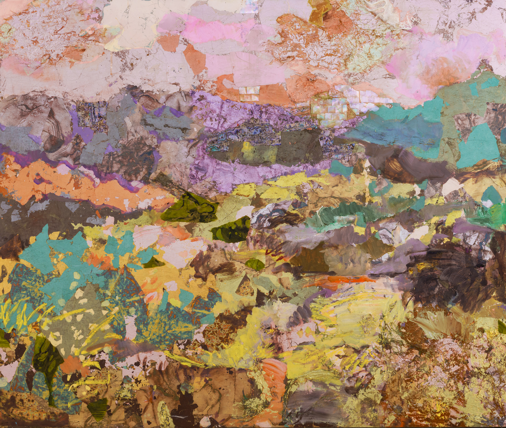 Re-entering this painting meant allowing the landscape to loosen rather than become more defined. Through successive layers of paper, paint, and mica, the surface grew increasingly textured, acquiring a new depth.