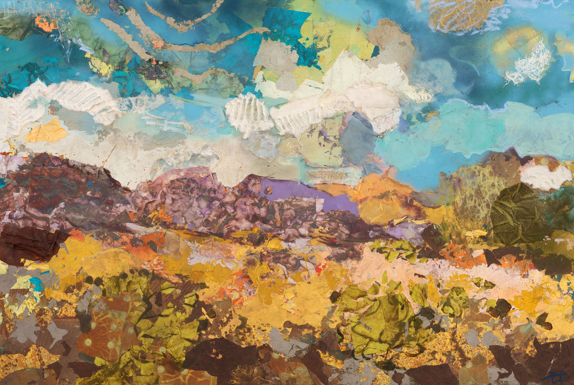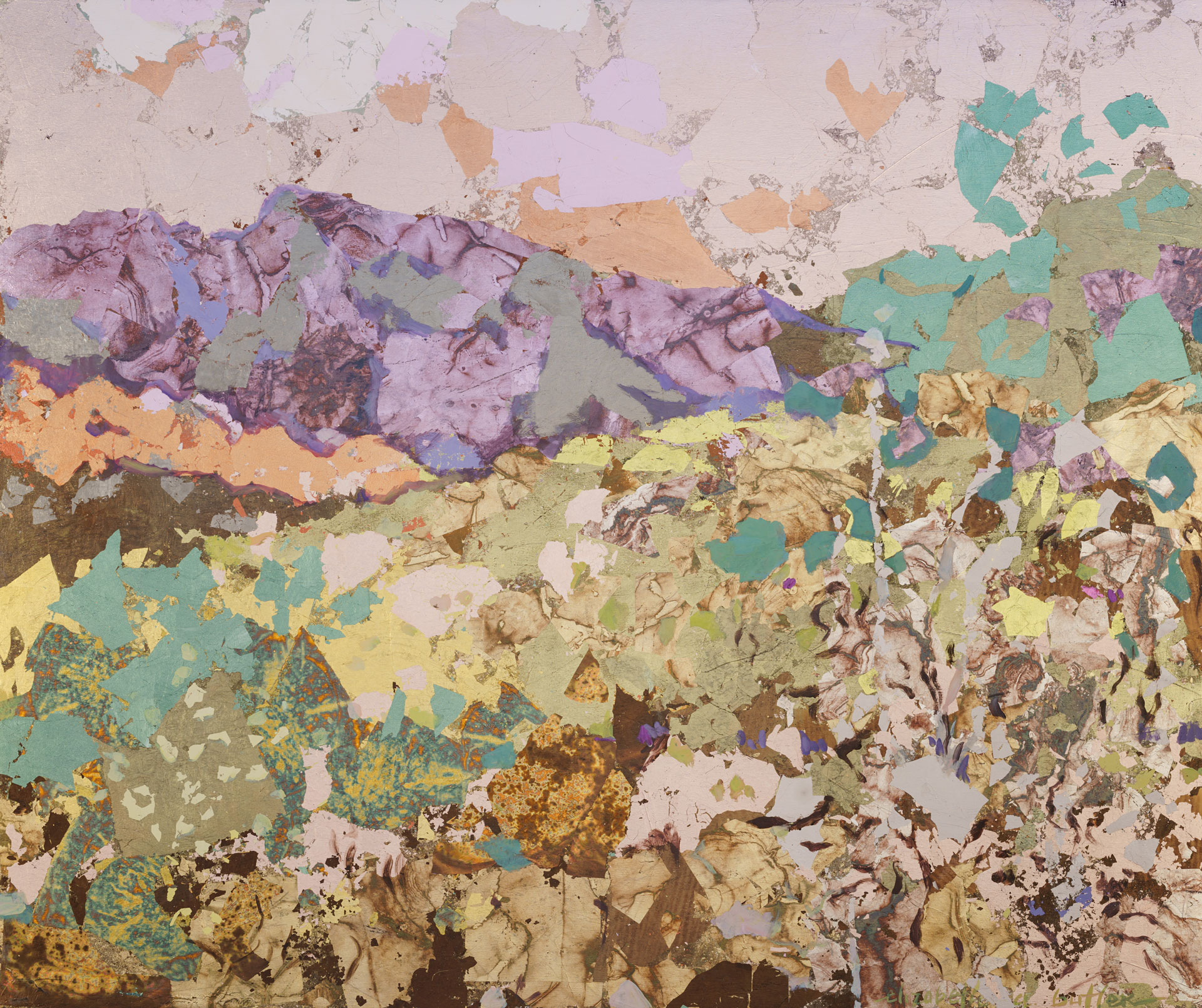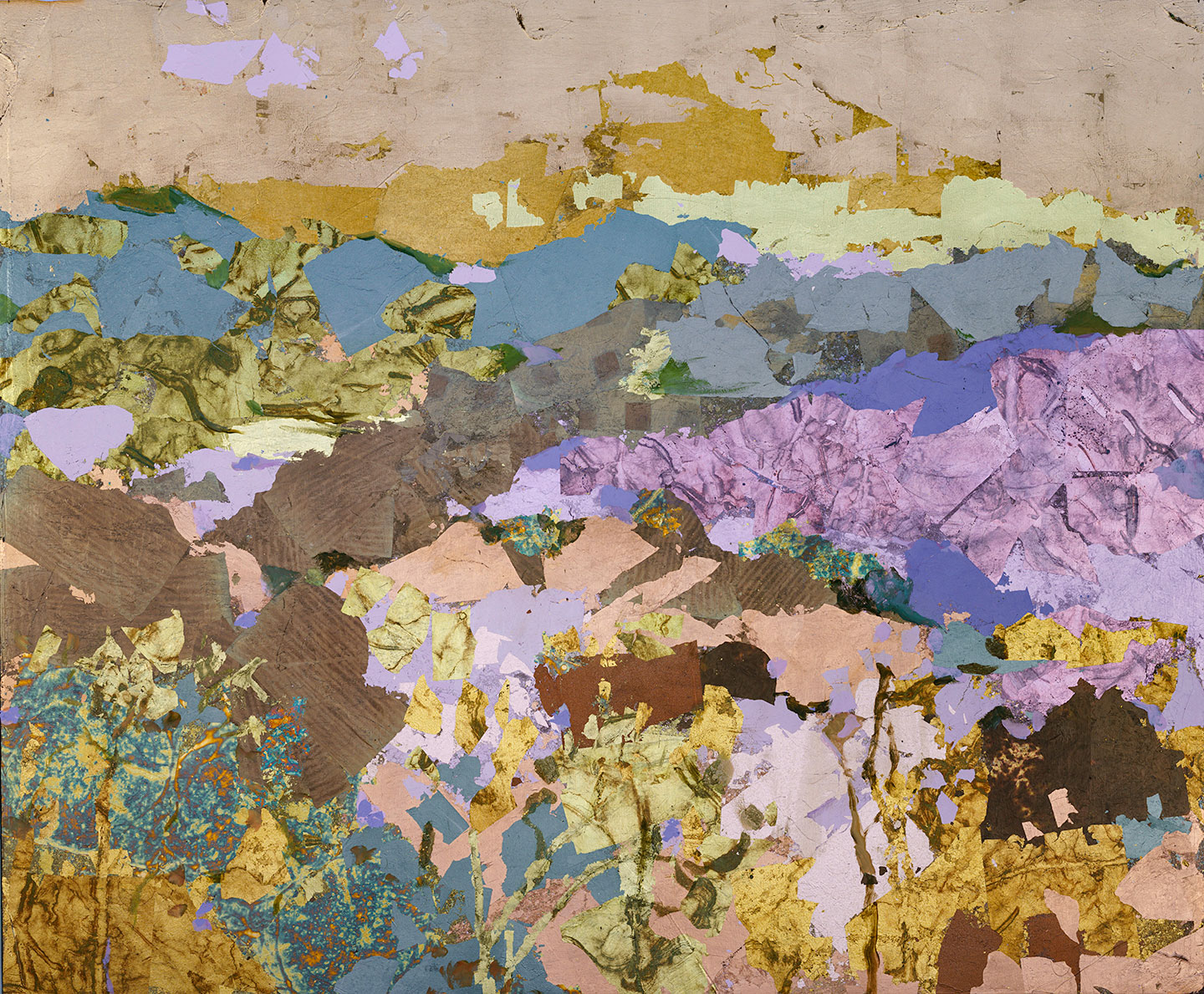 New materials entered the paintings — handmade paper, metal leaf, paint, and shell. Rather than repainting the landscape, I began building terrain across the surface.