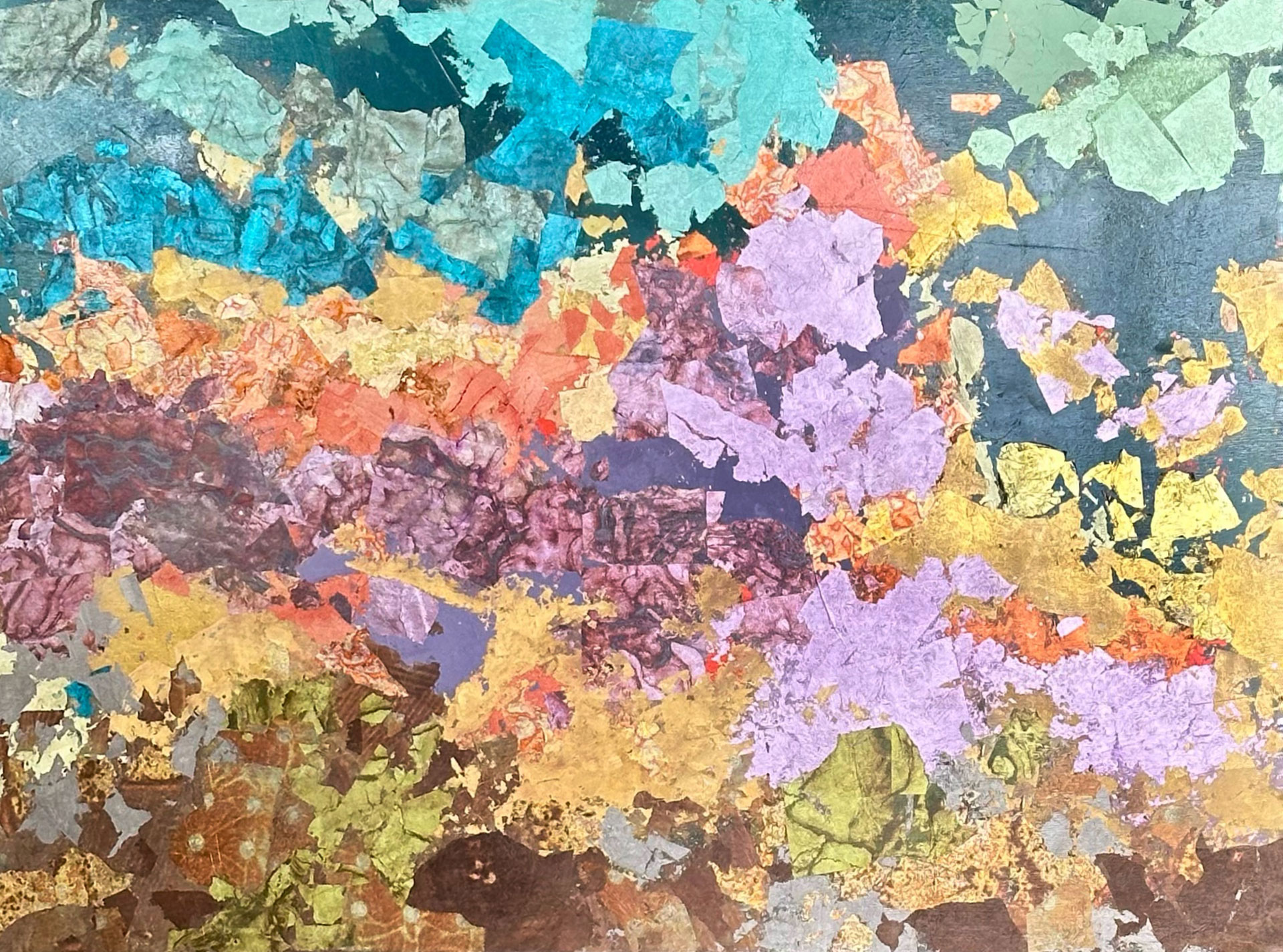 Re-entering this painting began with layering oil stick, torn paper, and metal leaf across the original surface. As pearl, paper, and paint accumulated, the image grew increasingly complex — almost chaotic at first. Over time the elements began organizing themselves through relationship rather than control, and the painting started behaving less like a picture and more like terrain- a place to re-enter rather than simply observe. That shift became the foundation for the entire Re-Enter Nature series.
